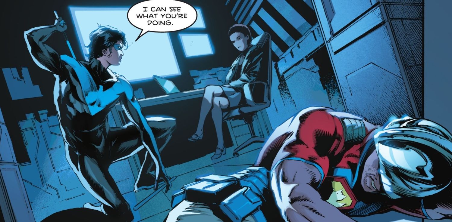 “/> Nightwing y los Titanes rastrean a Waller hasta la sede de la Oficina de Soberanía y se infiltran para detenerla. Sin embargo, Peacemaker está listo para acabar con Nightwing. Cuando Smith critica a Grayson por no proteger su cabeza con un casco, Nightwing muestra lo peligroso que es eso. volteando el casco de Peacemaker alrededor de su cabeza para cegarlo.