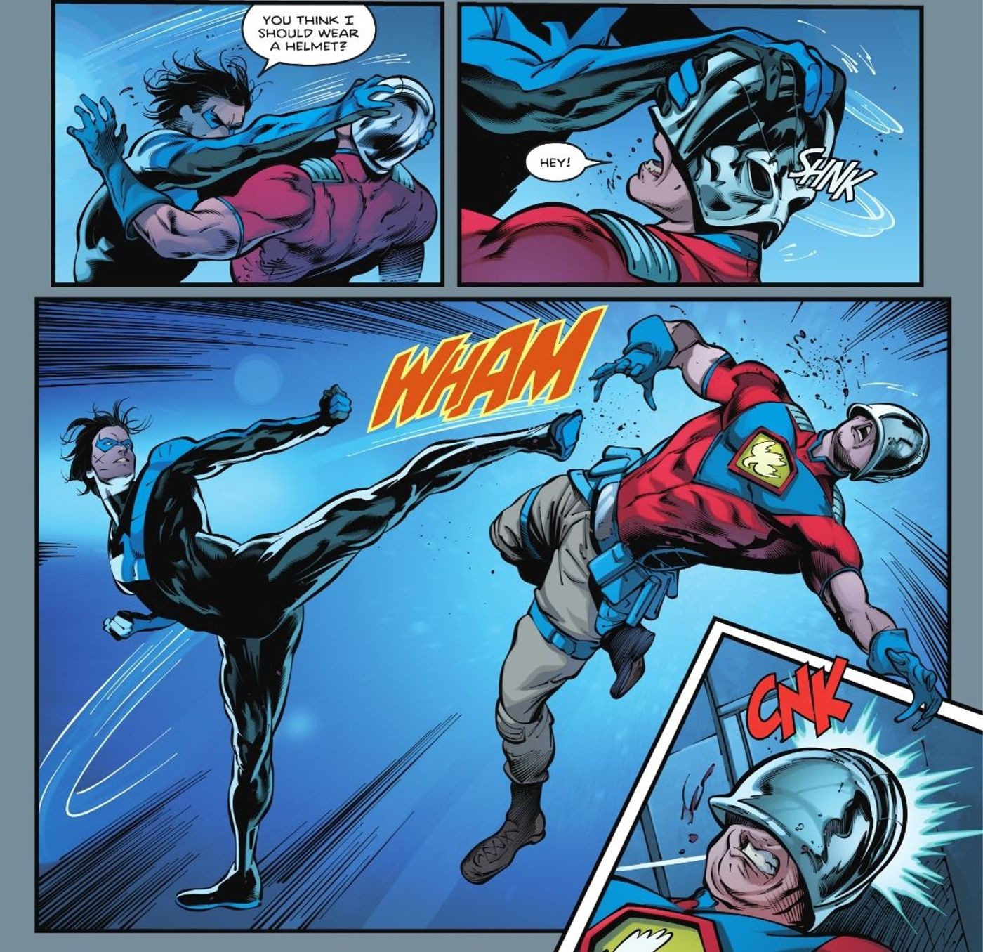 - Nightwing sorprende a Peacemaker al usar su propio casco contra él, demostrando el peligro de usar un casco mal adherido en combate.