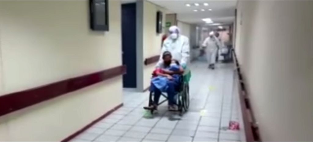 En un video subido por el personal médico, se observa cuando la niña de 3 años salió en brazos de su madre; ambas van en una silla de ruedas y llevan cubrebocas.