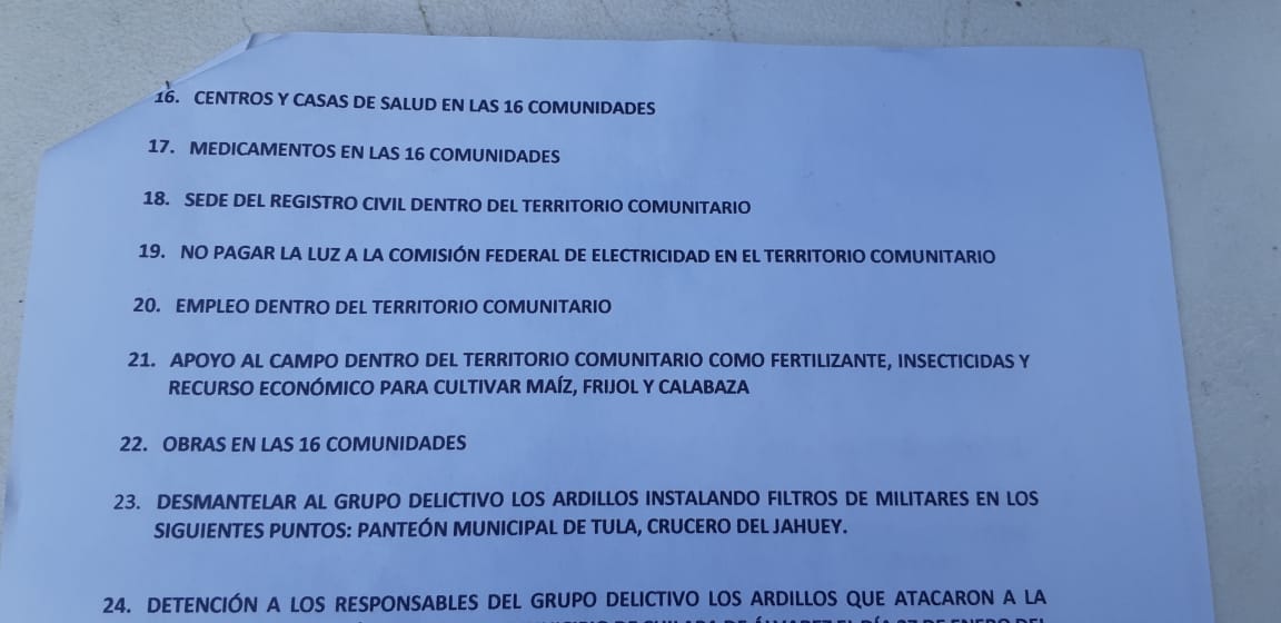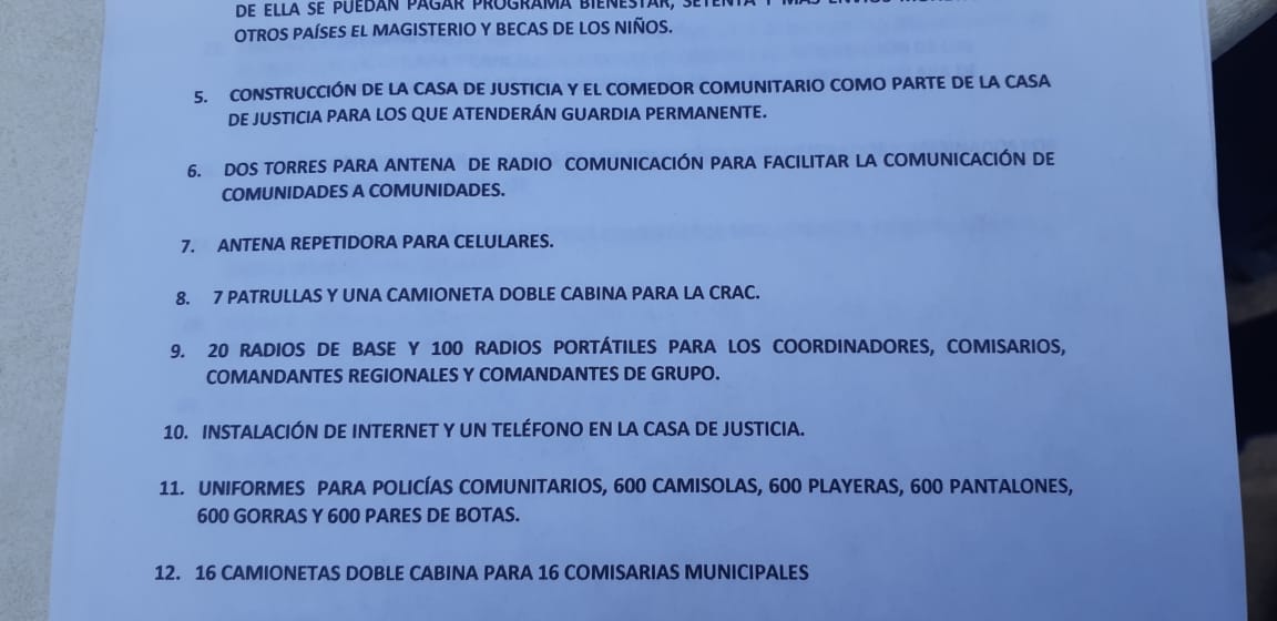 De las 29 demandas que tiene la CRAC-PF para las autoridades municipales, estatales y federales, el dirigente resalta las relacionadas con “Los Ardillos”: “desmantelar al grupo delictivo… instalando filtros de militares” en varios puntos, así como la “detención a responsables del grupo delictivo Los Ardillos que atacaron a una comunidad, y “son los mismos que han secuestrado y asesinado a 28 compañeros en un año”.