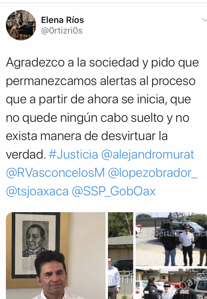“Hemos detenido a Juan Antonio Vera Carrizal, quien enfrentará la justicia por el terrible hecho de violencia cometido contra María Elena Ríos, joven saxofonista oaxaqueña, más tarde la Fiscalía General de Justicia de Oaxaca y la Secretaría de Seguridad Pública de Oaxaca (SSPO) darán más datos”, indicó el mandatario.