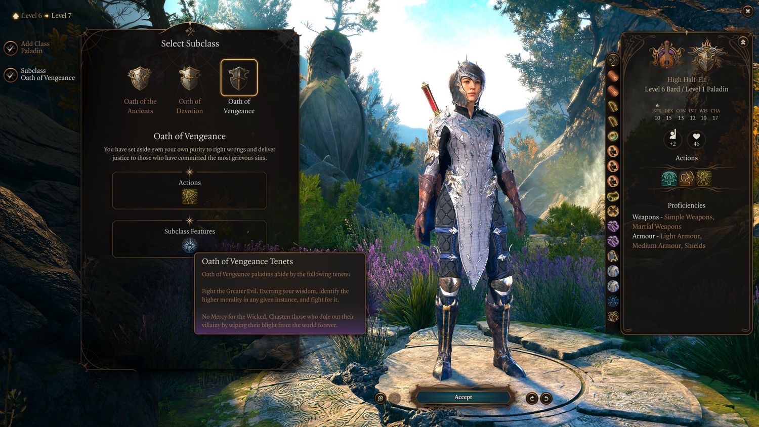 Al final del juego, tu personaje será una potencia en combate, usando espacios para hechizos para controlar el campo de batalla con hechizos de Bardo o para realizar ataques cuerpo a cuerpo de alto daño capaces de aplastar a la mayoría de los enemigos. Fuera del combate, tu personaje también será la cara perfecta para todo el grupo, con una estadística de carisma naturalmente alta y competencias que los impulsarán a través de pruebas de persuasión, engaño e intimidación. Puerta de Baldur 3 tiene muchas configuraciones multiclase geniales, y el Bardo/Paladín es particularmente formidable para tus enemigos.
