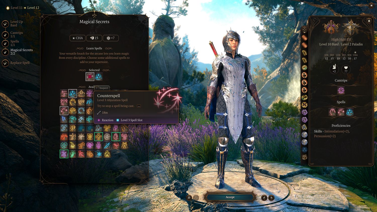 “/> Después de esto, continúa llevando a Bard al nivel 12. En general, debes apuntar a una división Bard 10/Paladin 2, con ataques Blade Flourish y Smite impulsados por Spell Slots y respaldados por hechizos de Bard de alto nivel. En el nivel 10 de Bardo, puedes acceder dos hechizos que no sean de Bardo a través de la función Secretos Mágicos, así que elige hechizos como Contrahechizo para anular la magia enemiga. Hechizos de alto daño como Cono de frio también son opciones sólidas.