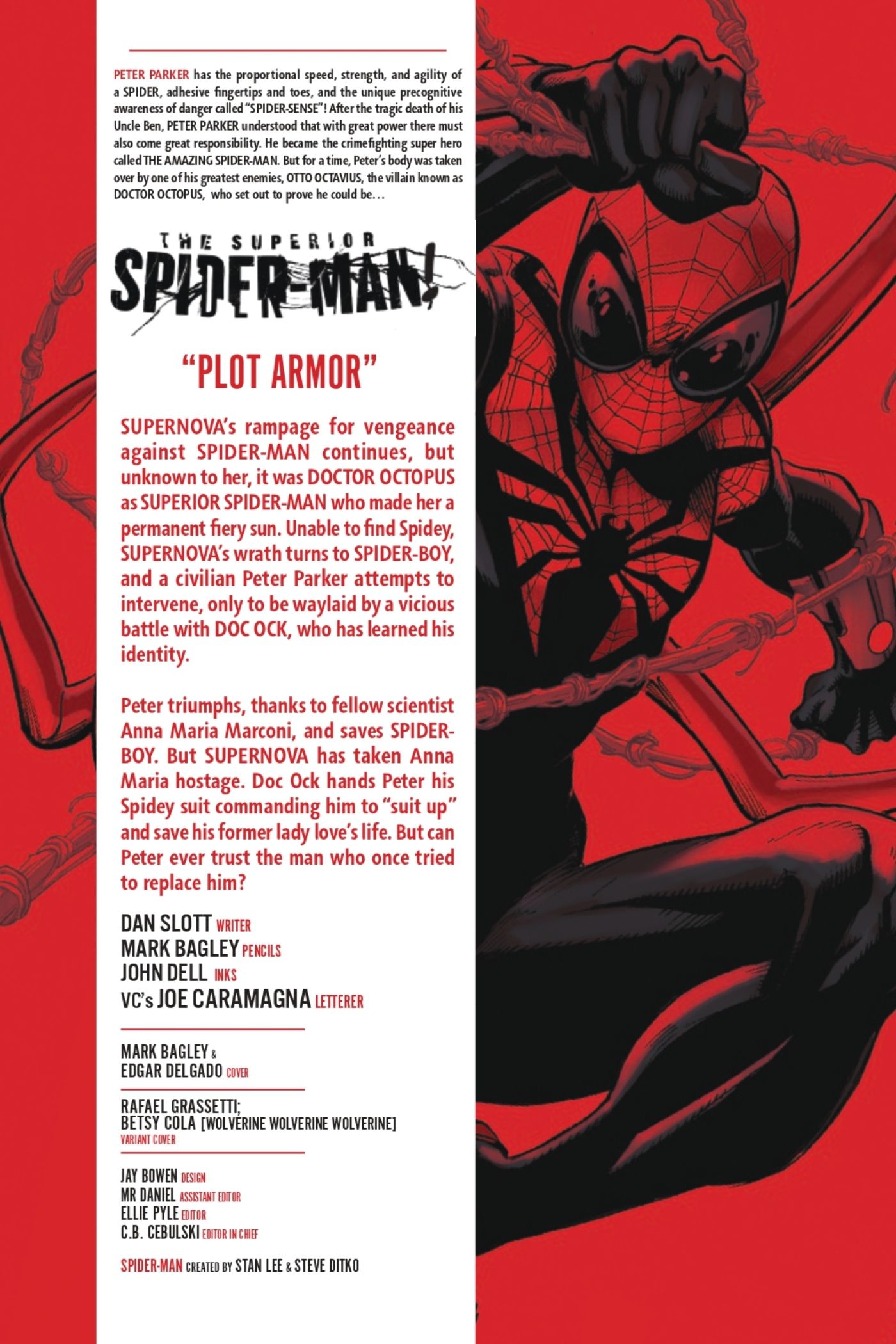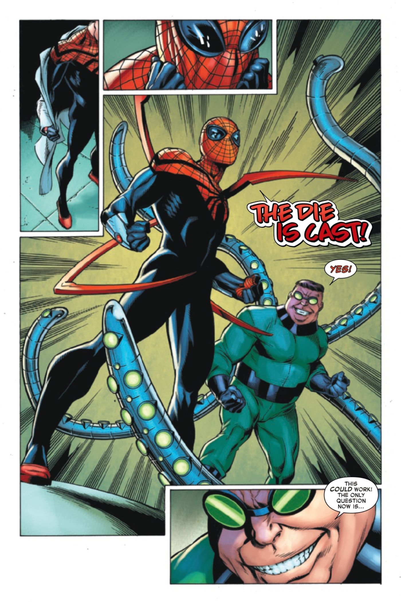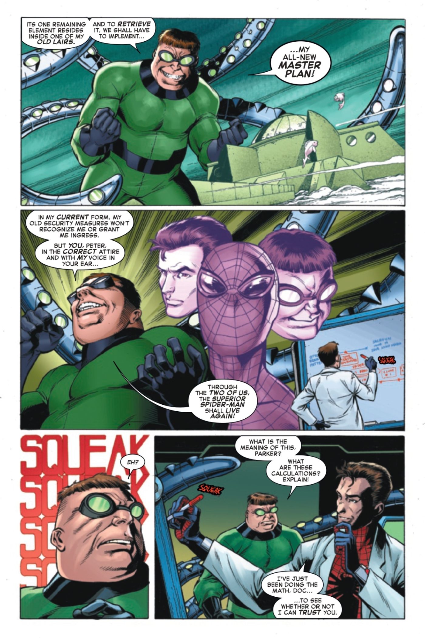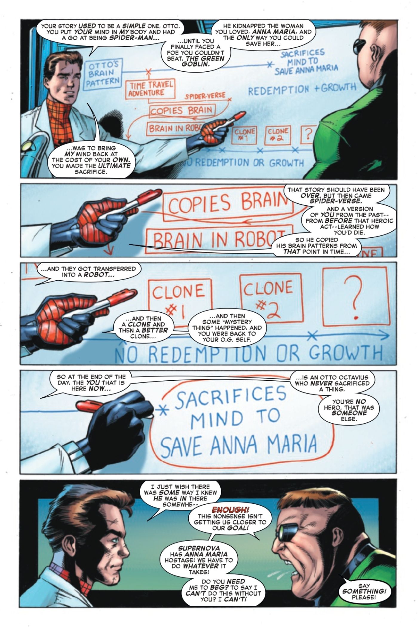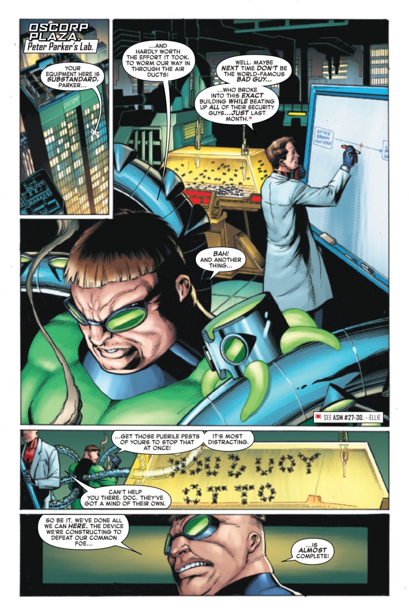 En un adelanto de Hombre araña superior #3 de Dan Slott y Mark Bagley, Peter Parker y el Dr. Otto Octavius ​​están trabajando juntos para ayudar a salvar a Anna Marie, quien está siendo rehén de Supernova. Los dos aliados reacios rápidamente se dan cuenta de que necesitan algo del laboratorio que Otto dirigió durante su época como Superior Spider-Man, cuando la mente de Doc Ock fue transferida al cuerpo de Spider-Man. Entonces, a Otto se le ocurre un plan sobre cómo infiltrarse en el laboratorio, pero Peter no se apresura a ponerse el traje, ya que todavía no está seguro de poder confiar en Doc Ock en absoluto.