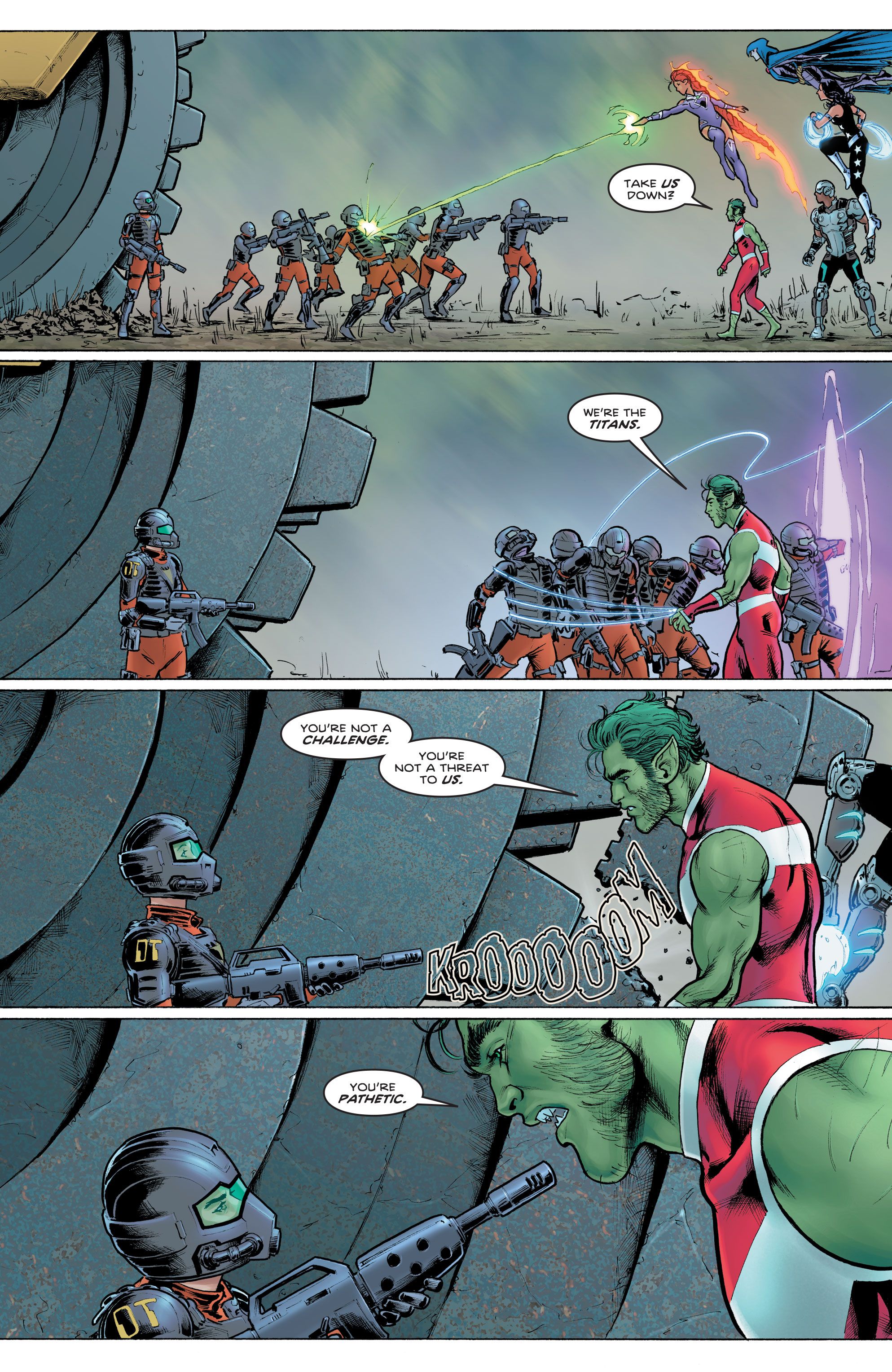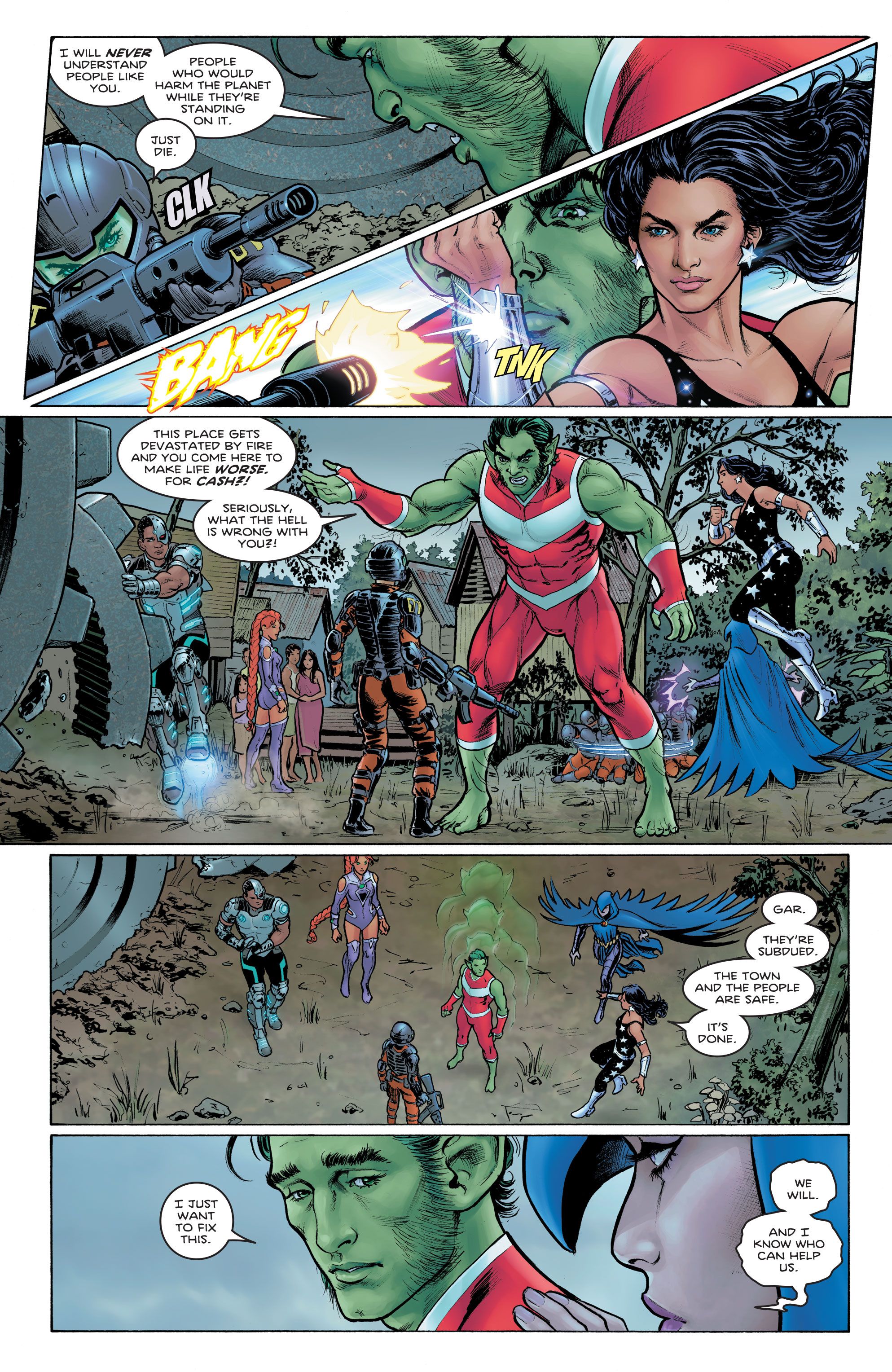 En una vista previa de Tom Taylor, Nicola Scott, Annette Kwok y Wes Abbott Titanes #5, los Titanes trabajan para proteger a los inocentes en Borneo que han sido atacados por los mercenarios del Equipo de Demolición. Enfrentando a los villanos, Chico Bestia crece hasta alcanzar una altura imponentey necesita ser disuadido por Donna Troy, tal como Cyborg tuvo que contenerlo previamente cuando pensó que había encontrado a los perpetradores que habían incendiado un tramo de selva tropical.