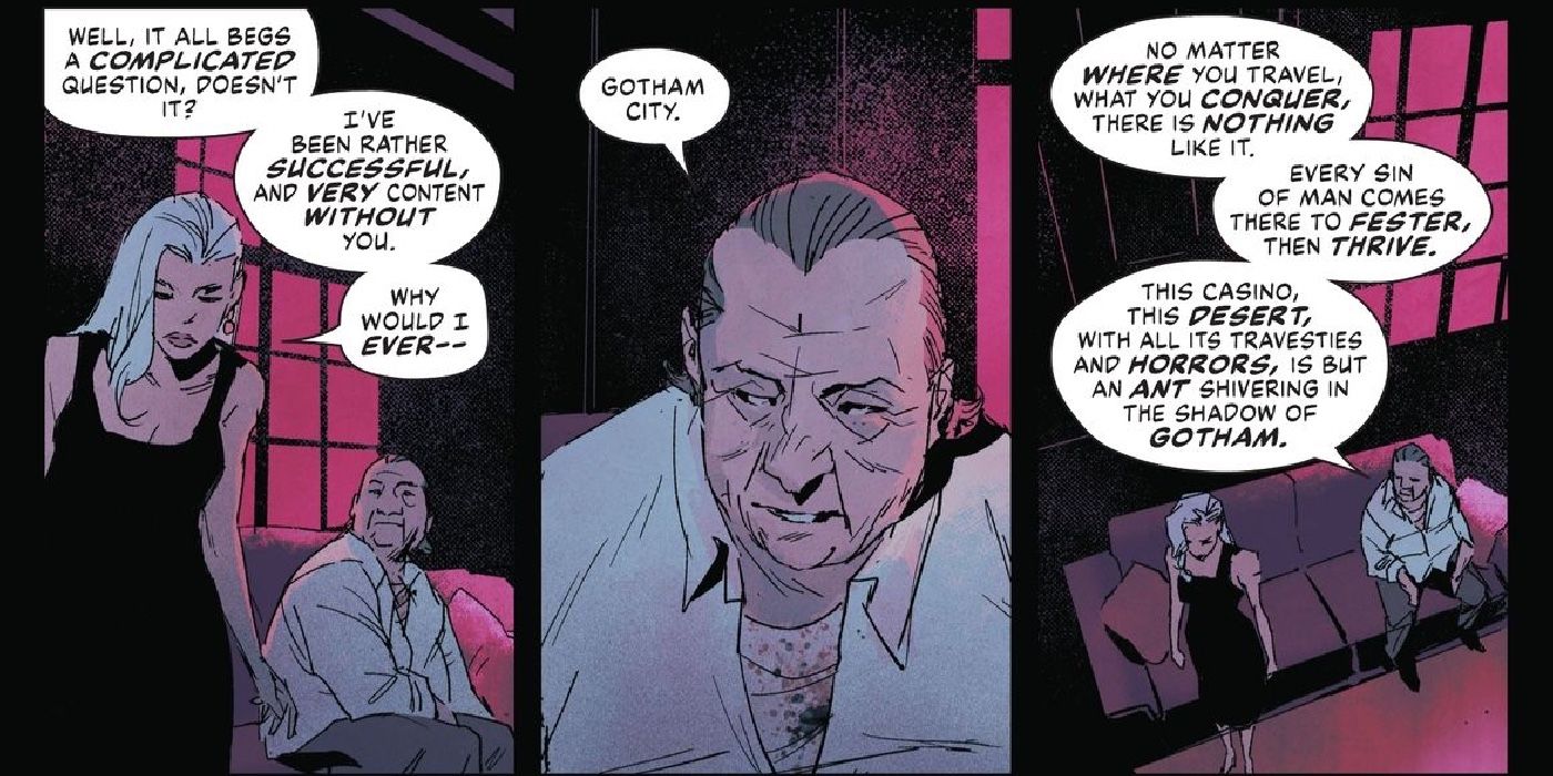 “/> Contar a los lectores por qué Gotham es un semillero de gente cruel e inusual en El pingüino #4, de Tom King y Rafael de Latorre, el razonamiento de Penguin es sólido y es una idea que resulta mucho más interesante cuanto más se explora. Al afirmar que “todo pecado del hombre llega allí para pudrirse y luego prosperar”, Oswald continúa comparando Gotham con Las Vegas diciendo: “Este casino, este desierto, con todas sus parodias y horrores, no es más que una hormiga que tiembla en la sombra. de Gotham”, esencialmente razonando que los criminales acuden en masa a Gotham como si fuera un campo de pruebas de crimen y corrupción. algo que seguiría sucediendo ya sea que Batman merodeara por sus calles o no.
