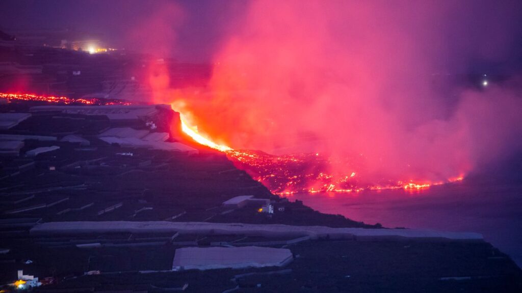 Faltaba una hora para la medianoche en Canarias cuando desembocaba en el mar la colada de lava emanada por el volcán que rompió en Cabeza de Vaca, en la isla de La Palma. Era lo previsible, aunque los ritmos de la erupción y la orografía del valle de Aridane hicieron dudar si llegaría y, sobre todo, por dónde iba a discurrir. Los modelos indicaban que las inclinaciones del terreno llevarían la lengua candente por esa pendiente hasta los acantilados. Por tanto, lo natural sería que de momento siguiese fluyendo por donde le dicta el terreno. Pero no tiene por qué seguir el mismo cauce permanentemente solo por haber tocado agua en ese punto.