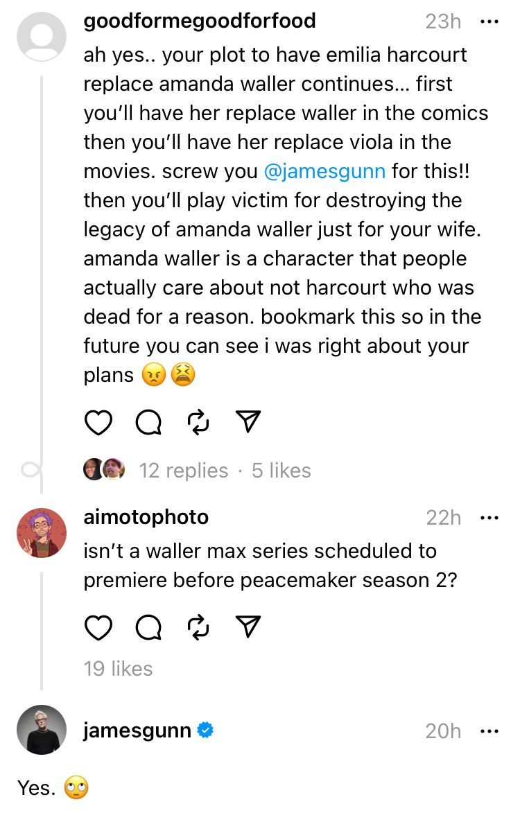 En otra respuesta en Threads, Gunn respondió a las críticas de un usuario sobre Emilia Harcourt de Jennifer Holland.