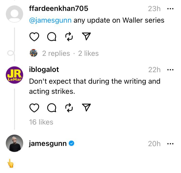 Otro fan comentó: “No esperes que durante las huelgas de escritura y actuación.“, y Gunn se hace eco de ese mensaje usando un emoji que señala. Las huelgas del Writers Guild of America y SAG-AFTRA han provocado el retraso de varias películas y programas, y sin un final a la vista, es difícil imaginar cuándo trabajar en Waller se reanudará.