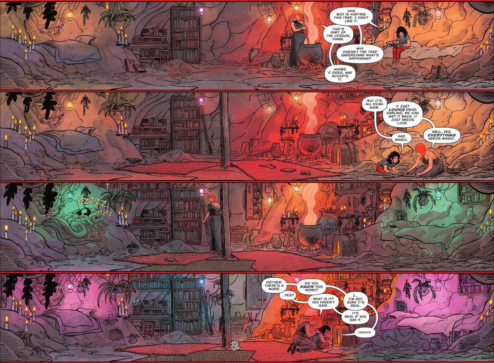Lo que comienza como una roca estéril se convierte en un hogar verde gracias a la compasión de Diana a medida que crece. Es un montaje poderoso, que declara desde el comienzo del libro que El amor y la compasión son centrales en la tesis de Wonder Woman, incluso una versión de ella “del infierno”. Este momento por sí solo restableció mi fe en esta serie.