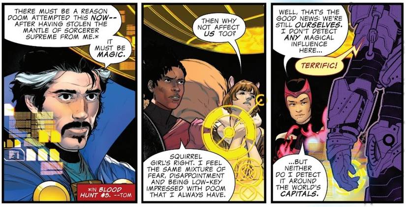 Entonces no es solo como, Oh, Squirrel Girl está aquí porque a Ryan le gusta Squirrel Girl. Squirrel Girl está aquí y tiene un papel genial que desempeñar. Ella se ha encontrado [Doom] Antes, ella sabe cómo es. Y nos permite tener algunas discusiones realmente interesantes en el lado del héroe sobre, como, como, ¿Qué estamos haciendo aquí? ¿Qué es lo correcto que debe hacer aquí? ¿Qué es lo ético que debe hacer aquí? Esas son preguntas de niña ardilla. Ella está involucrada en esas conversaciones.