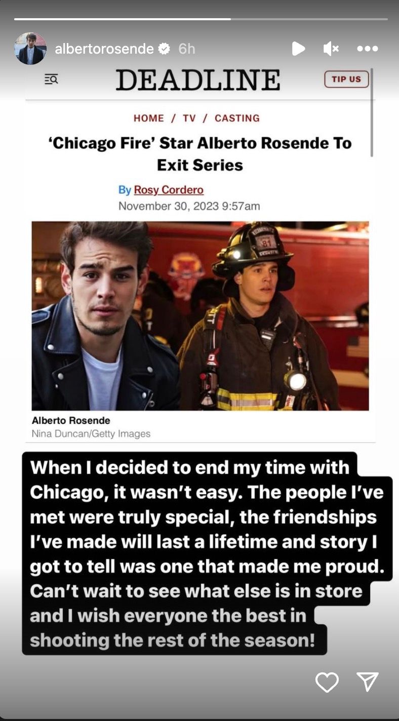 En una historia de Instagram, Rosende habló sobre su decisión de irse Fuego de Chicago temporada 12.