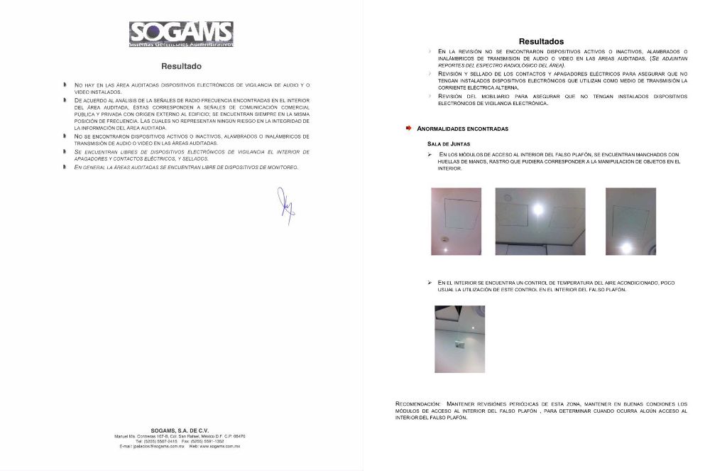De acuerdo con el informe del PAN, en 2018 se revisó todo el espectro radio-frecuencias áreas, espectro infrarrojo aéreo, las líneas de alimentación de voltaje e instalación telefónica local, así como la verificación de la integridad del mobiliario, escritorios, lámparas, la inspección de los espacios libres entre los falsos plafones y losas de concreto.