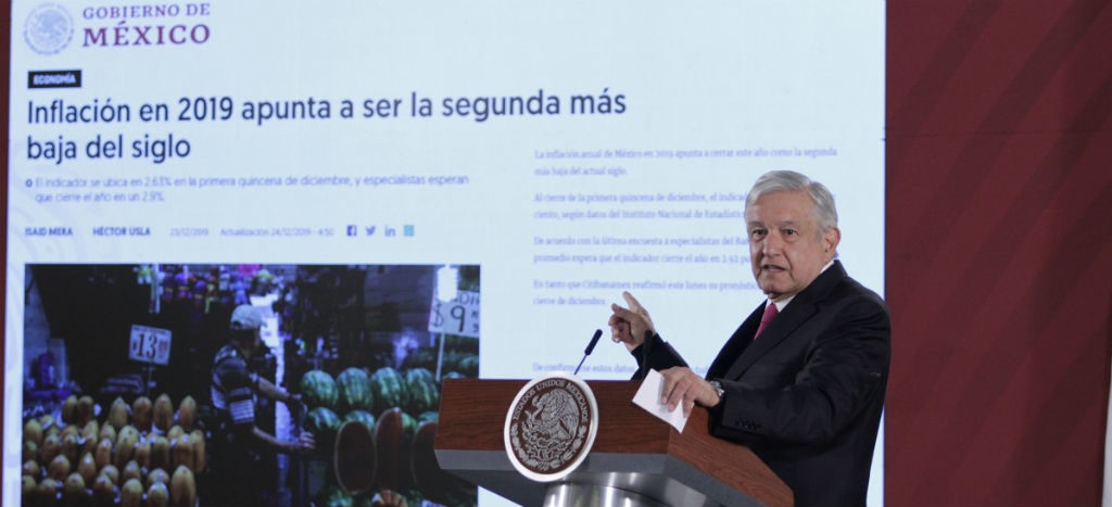 El presidente Andrés Manuel López Obrador afirmó que el 2019 concluirá con muy buenos resultados en materia económica, ya que la inflación de este año apunta a ser la segunda más baja del siglo y eso se ve reflejado en los bolsillos, en la bolsa del mercado y con lo que puede llegar a la mesa de los mexicanos.