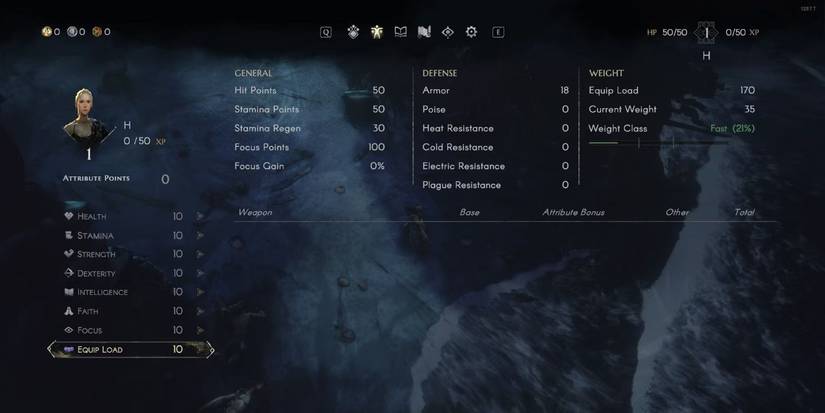Si prefieres una estructura pesada pero quieres facilitar tu carga de transporte, puedes aumentar tu capacidad de carga subiendo de nivel la estadística de carga de equipo. Esta es una de las mejores estadísticas para actualizar primero, ya que representa el peso total que tu personaje puede manejar para los elementos equipados antes de experimentar una carga. Cada punto agregado a Equip Load aumenta el peso de carga de tu personaje en 10 puntos.lo que le permite mantener una constitución pesada sin los inconvenientes de un movimiento lento.