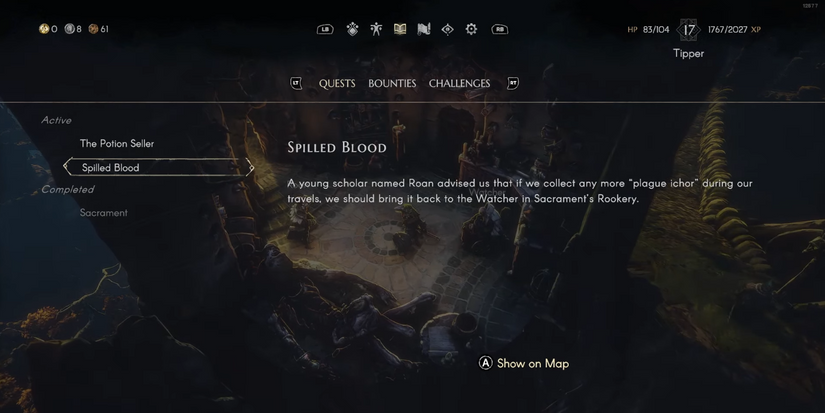 Ampliar el almacenamiento de tu inventario implica avanzar a través de la historia principal hasta tu primera batalla con el jefe contra Warrick the Torn justo antes de llegar a Sacrament. Derrotar a este jefe produce un objeto conocido como Plague Icor. Una vez que llegue al Sacramento, Dirígete a la Torre Rookery y localiza al Vigilante..