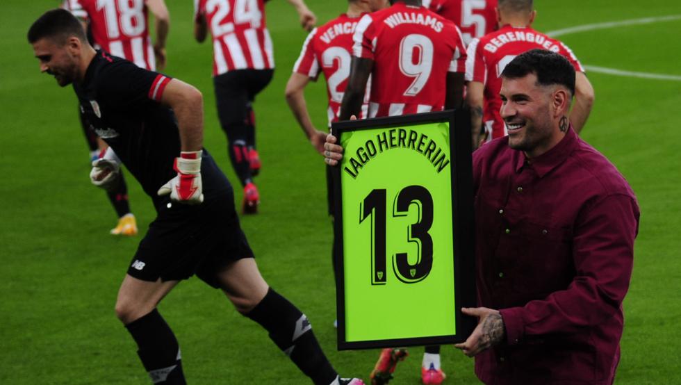 El Athletic aprovechó la visita del Real Madrid a San Mamés, último partido de Liga en casa para los leones, para tributar su particular despedida a Iago Herrerín. El portero bilbaíno, de 33 años de edad, deja la disciplina rojiblanca tras ocho temporadas defendiendo la portería del primer equipo. El mítico Iribar y Gorka Iraizoz le acompañaron al centro del campo, en medio de un pasillo de honor realizado por sus compañeros antes del arranque del duelo ante los merengues, a la hora de recibir un camiseta enmarcada con el número 13