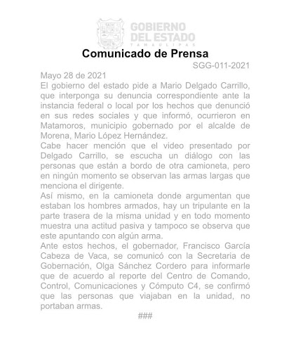 A continuación, el comunicado de prensa difundido por el Gobierno de Tamaulipas: