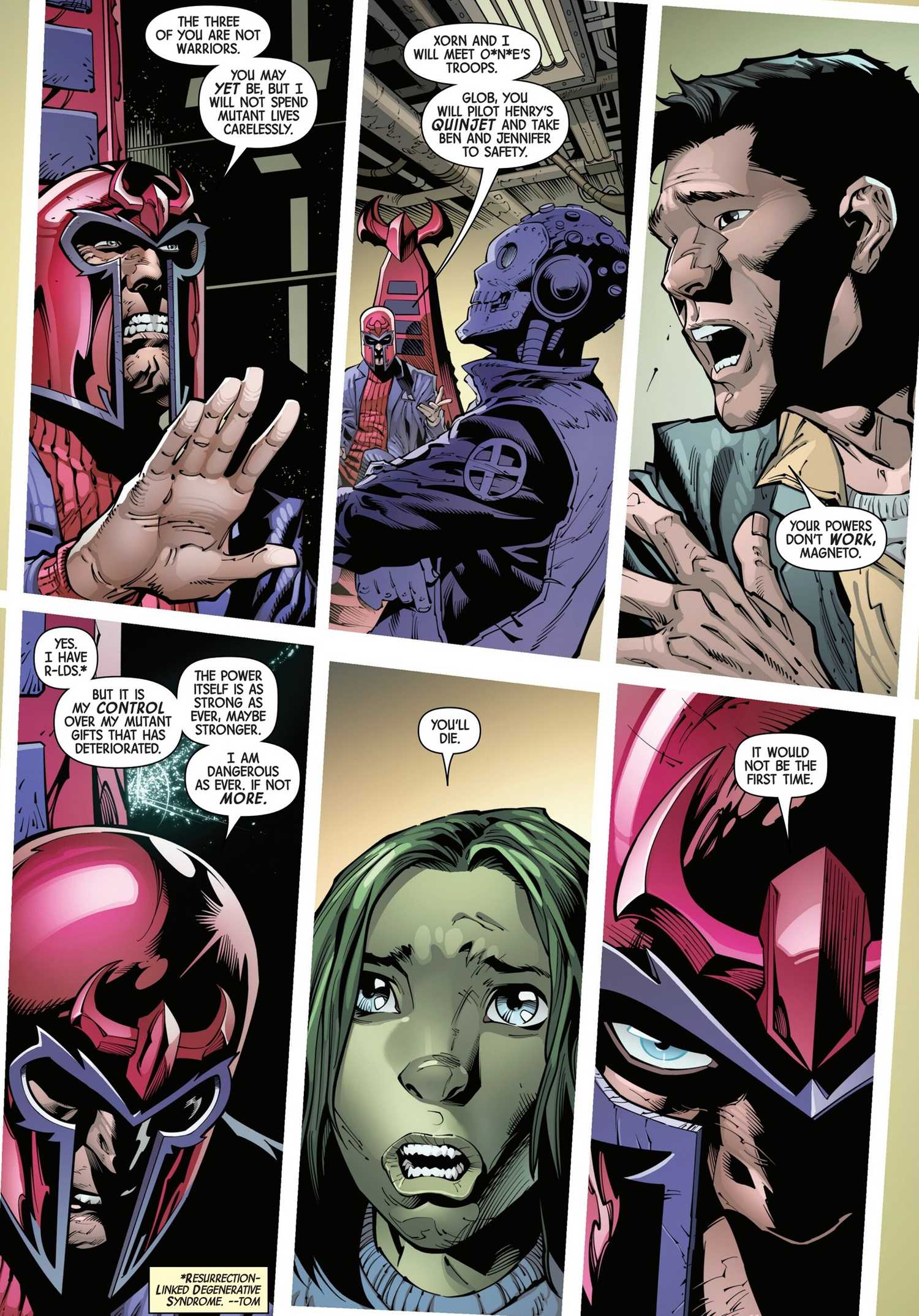 Aunque Magneto sufre de R-LDS, enviando sus poderes en espiral fuera de control, se niega a “llamar a otros para que peleen [his] guerra“ El momento ofreció un vistazo a su proceso de pensamiento y demostró que Magneto enfrentaría su magnetismo incontrolado contra O*N*E*en lugar de cumplir con la alianza Cyclops simplemente forjado.
