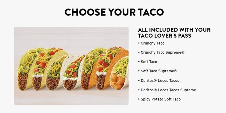 Las opciones disponibles para los suscriptores de Taco Lover’s Pass también son bastante escasas, ya que solo pueden elegir entre siete elementos: Crunchy Taco, Crunchy Taco Supreme, Soft Taco, Soft Taco Supreme, Spicy Potato Soft Taco, Doritos Locos Tacos y Doritos Locos Tacos Supremo. En cuanto a la propuesta de valor, aquí hay un resumen básico. Un Doritos Locos Tacos Supreme cuesta $ 2.69 en un día normal. Un suscriptor de Taco Lover’s Pass puede disfrutar de uno diario durante 30 días seguidos y ahorrar $ 70 cada mes. Eso también significaría bombear 190 calorías al cuerpo cada día, pero el suscriptor ya lo sabe.