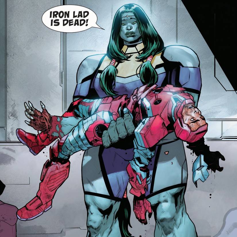 Ultimate Hulk no es el héroe de clase mundial que es en la Tierra-616, es un villano del más alto nivel. Hulk es miembro del Consejo de Creadores, es el líder de su propio culto y es responsable de realizar una serie de horribles experimentos gamma en sujetos humanos. Para empeorar las cosas, este Hulk también ejerce el poder de Iron Fist, lo que lo hace aún más terriblemente poderoso. Entonces, cuando los Ultimates lo desafían, no debería sorprender que uno de los héroes termine muerto. Y ese héroe era Iron Lad, también conocido como Tony Stark.