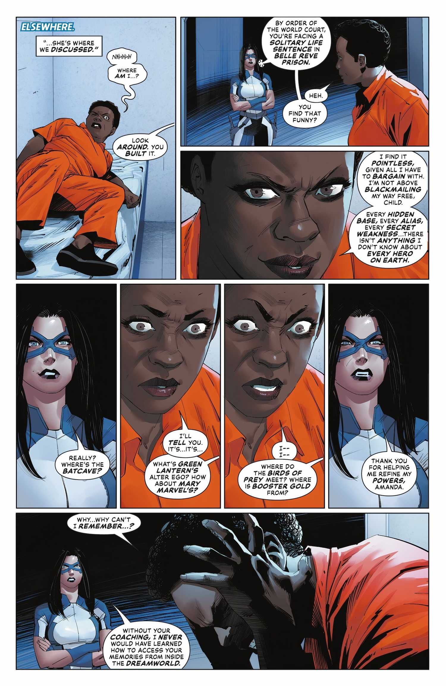 Ahora, una vez más, los héroes de DC se encuentran en una posición similar, después de haber borrado la mente de Amanda Waller. Muchos de los mismos problemas que rodearon las borraduras mentales del Doctor Light rodearon a Waller. Waller tiene información sobre todos los héroes y villanos de la Tierra y, al igual que Light, planeó convertir ese conocimiento en un arma. Waller también tiene una manera de arrollar a la gente y podría haber cumplido sus amenazas. Ninguna prisión en el universo podría detener a Waller, por lo que la única forma de avanzar era asegurarse de que olvidara lo que sabía. Dreamer usó sus poderes para hacer precisamente esto.