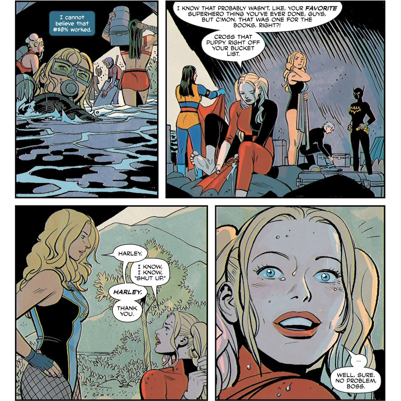 Aunque quizás sea el plan más asqueroso que se le podría haber ocurrido al equipo, esta muestra de confianza vale la pena, ya que el favor de Harley por parte de King Shark logra llevarlos a la isla sin ser detectados. Este es un gran momento tanto para Harley como para el equipo en su conjunto. Harley fue agregada a la lista actual de Birds of Prey debido a su condición de comodín, un rasgo que se considera efectivo en combate. Sin embargo, debido a este factor comodín, al principio sus compañeros de equipo no confiaban fácilmente en ella. Cuando el plan funciona, Dinah, la líder del equipo, agradece a Harley, una señal de respeto que es claramente inesperada para Quinn.