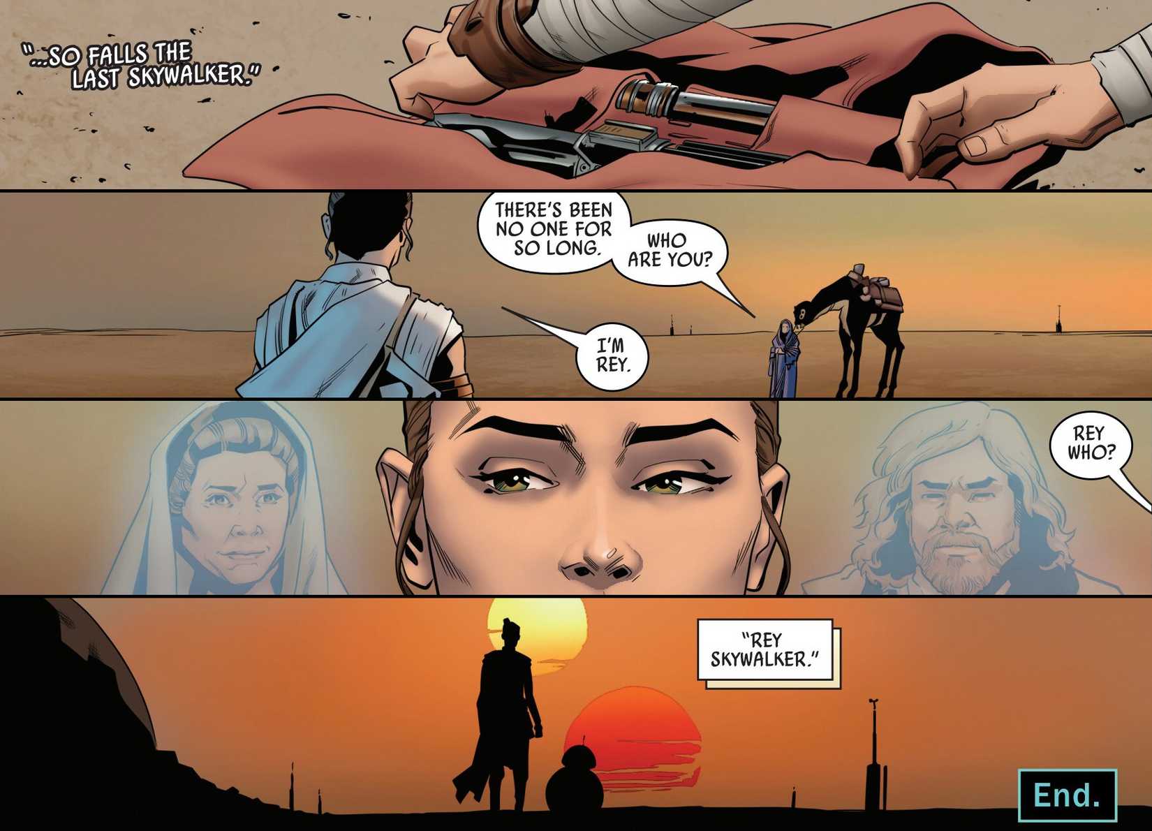 Después de que Rey convoca a todos los Jedi para ayudarla a derrotar a Palpatine de una vez por todas, y es curada por el sacrificio de Ben, ella toma el viaje esperado a la granja de Lars en Tatooine. Pero cuando Leia toma el nombre de Skywalker en el cómic, su significado está perfectamente claro.