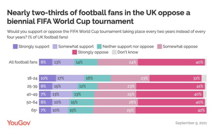 Casi dos tercios de los aficionados al futbol en Gran Bretaña se opone a tener una Copa del Mundo cada dos años tal y como quiere plantear la FIFA, según los datos de una encuesta realizada por la compañía de investigación YouGov.