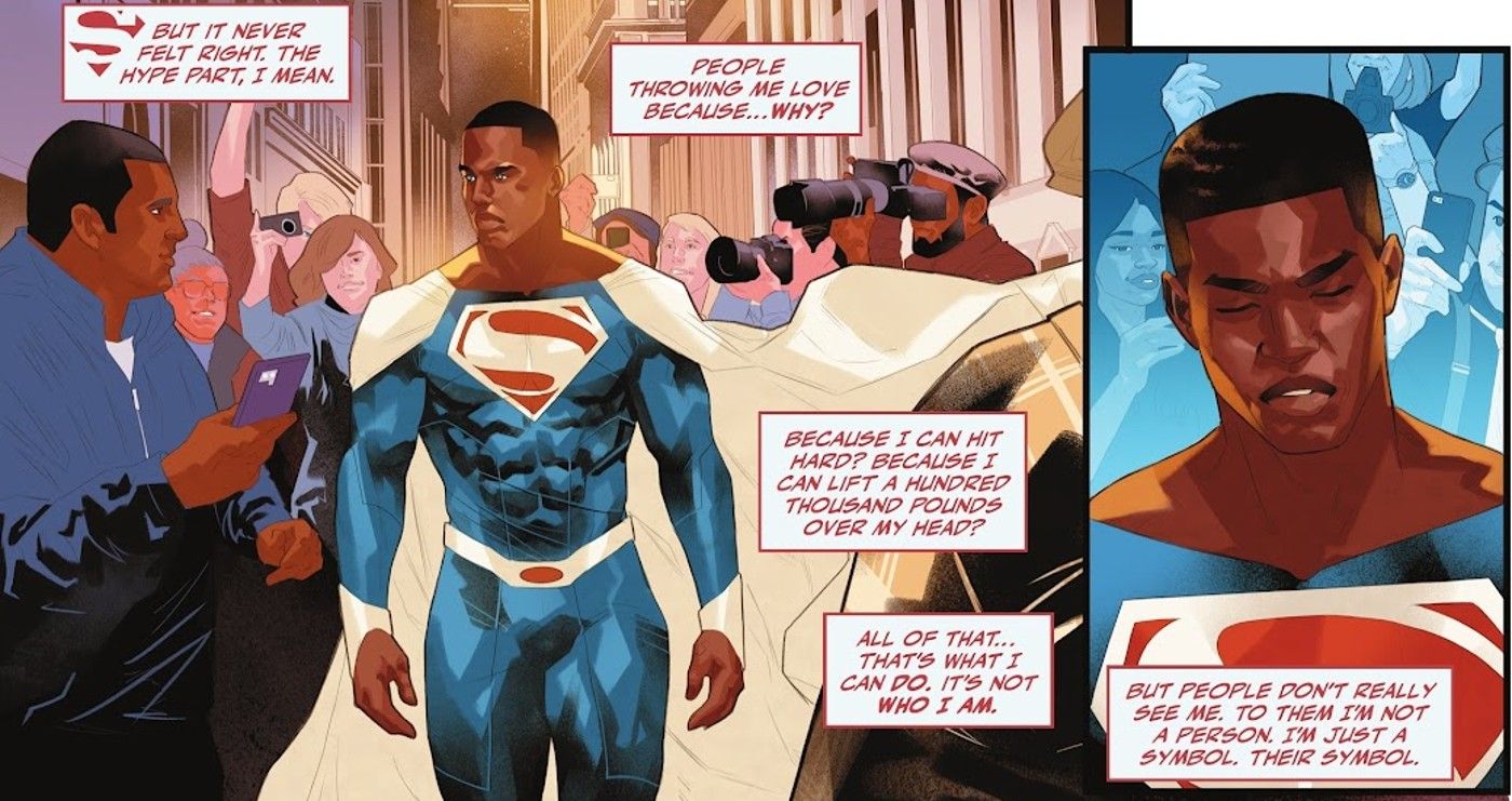 Superman habla en profundidad sobre adoptar el manto de Clark Kent, pero solo ser visto y tratado como el símbolo que lleva en lugar de una persona completa y compleja. Luego, cuando su símbolo no está a la altura de las expectativas, está bajo escrutinio. No ha aceptado la adoración de héroes como lo hizo Clark antes que él. “No quiero nada de eso“, monólogo. Sólo quiere que lo dejen en paz y simplemente existir en “pura negrura.“Sin embargo, no puede, y en lugar de huir de las responsabilidades, abraza aquello que le hace diferente.