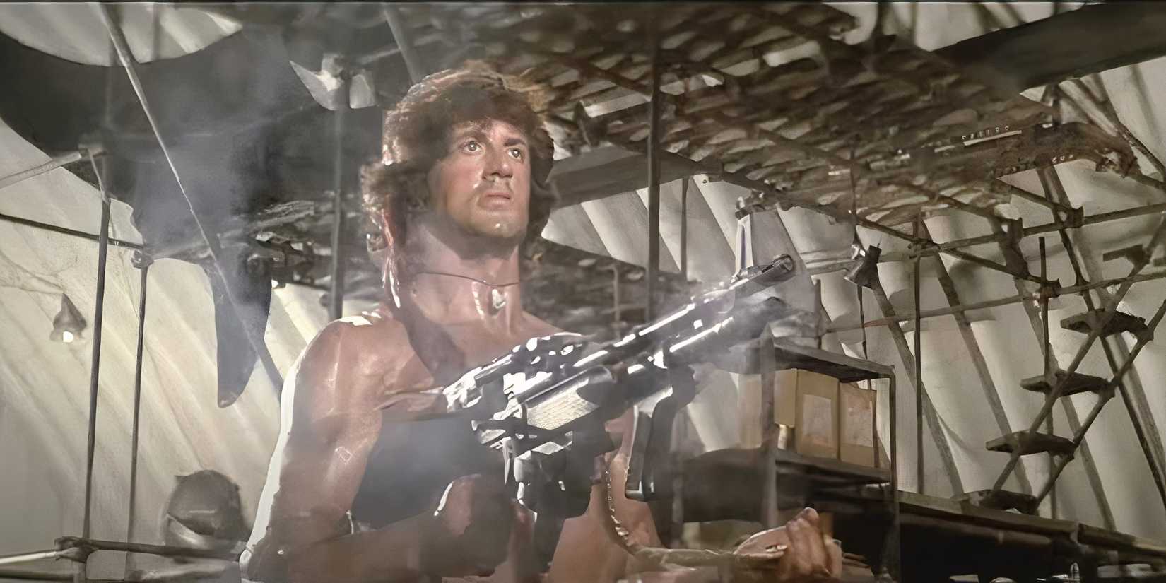 A pesar de los años 1982 Primera sangre Al estar basado en una novela independiente del mismo nombre, Stallone marcaría su primer regreso como John Rambo en 1985. Rambo: Primera Sangre Parte II. Después de ser abandonado mientras estaba en una misión para rescatar a prisioneros de guerra estadounidenses, el personaje de Stallone regresa al centro de comando de la misión y procede a destruir la sala de ordenadores con una ametralladora de alto calibre Tomado desde el costado de un helicóptero.