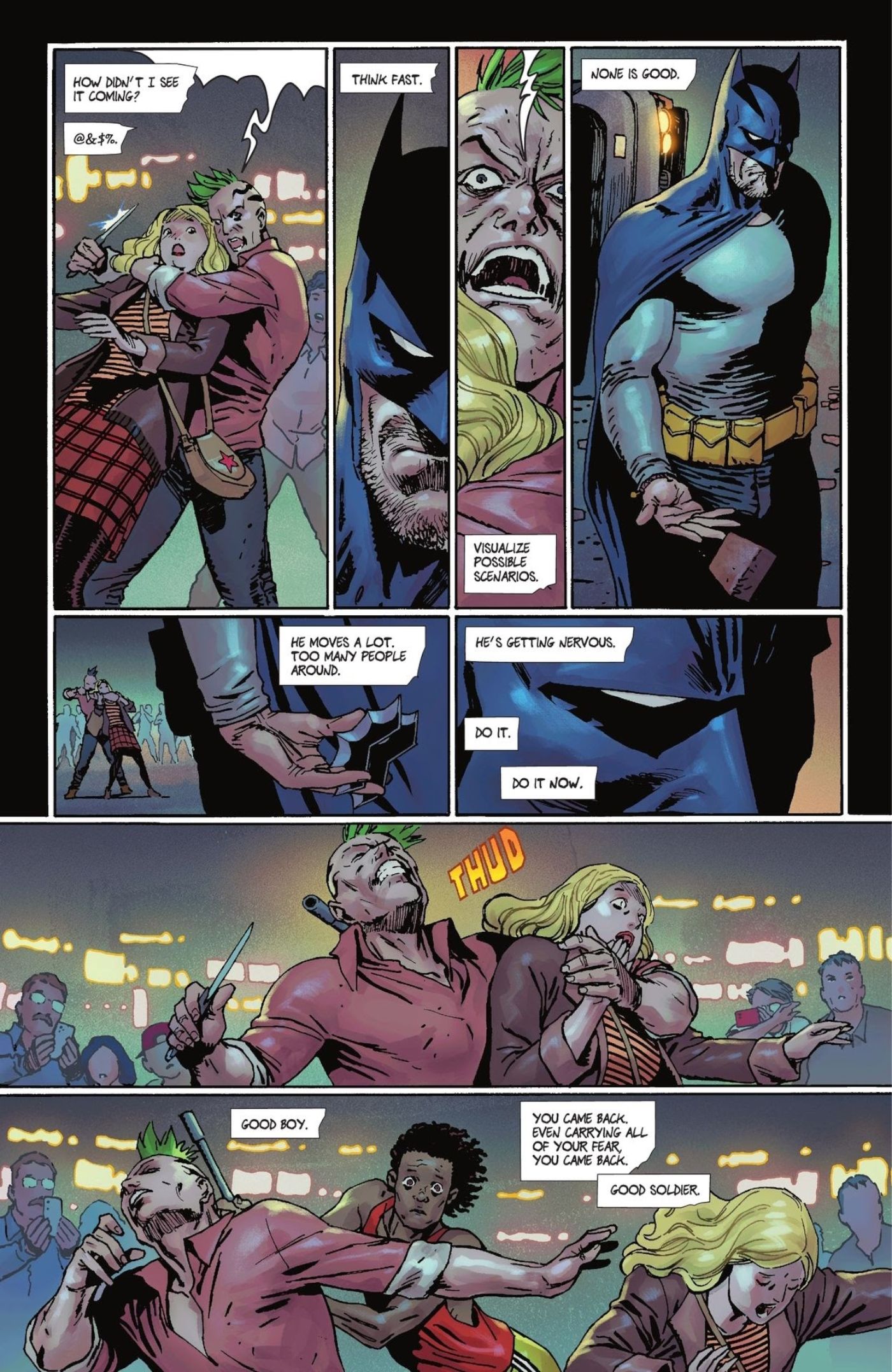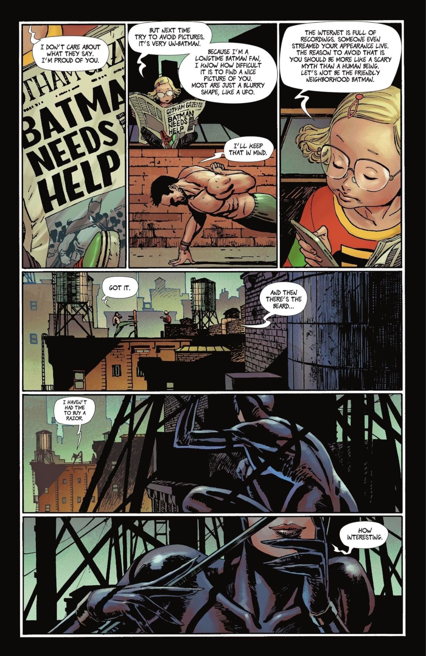 “/> Esta chica, llamada Aurora, le está enseñando a Bruce todo lo que sabe sobre Batman, y una de las lecciones más importantes que tiene para enseñarle se produce después de que él salva a una anciana en un área pública. Una de las partes más importantes de ser Batman, según Aurora, es no ser visto, pase lo que pase. En sus palabras, Bruce debería evitar ser el “amigable barrio Batman“.