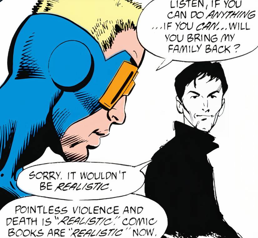 Animal Man finalmente pregunta si Morrison puede devolver la vida a la esposa e hijos de Buddy. Desafortunadamente, Morrison niega la solicitud, diciendo sarcásticamente que hacerlo no sería “realista”. Morrison realmente se inclina en esa crítica y dice que debido a que los cómics son ‘realistas’ ahora, la muerte y la violencia sin sentido son lo que importa.