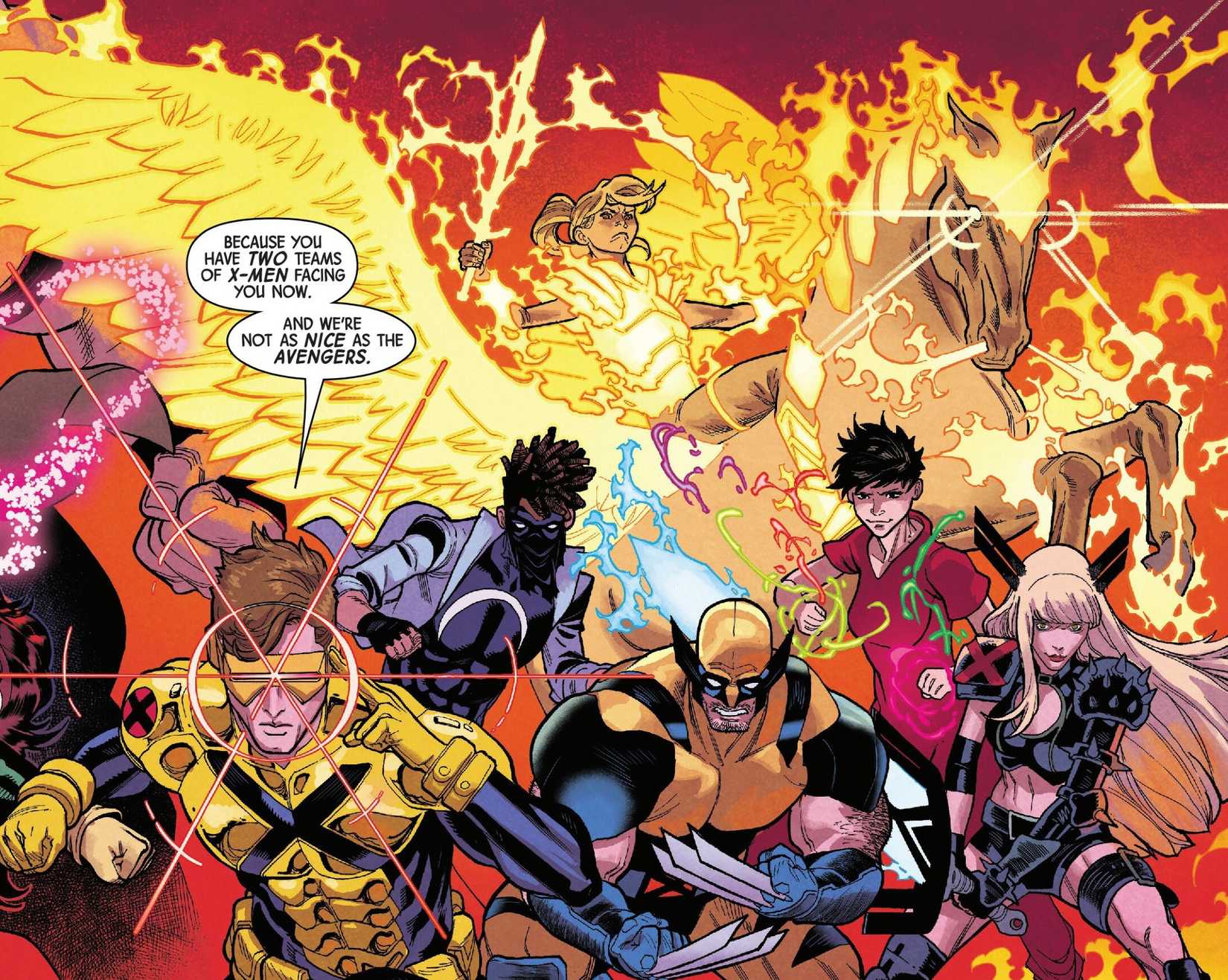 Si bien los X-Men y los Vengadores luchan por el mismo bando, los propios X-Men a menudo se ven obligados a ser más duros que otros grupos de superhéroes debido a la naturaleza de las amenazas que enfrentan. Ambos equipos se enfrentan a supervillanos, eso sí; pero las amenazas de los X-Men también incluyen grupos como los Purificadores y Orchis, que quieren mutantes muertos y trabajan activamente para lograr ese objetivo. Este tipo de amenazas son exclusivas de los X-Men como mutantes.ya que no son el tipo de amenazas que los Vengadores tienen que enfrentar.