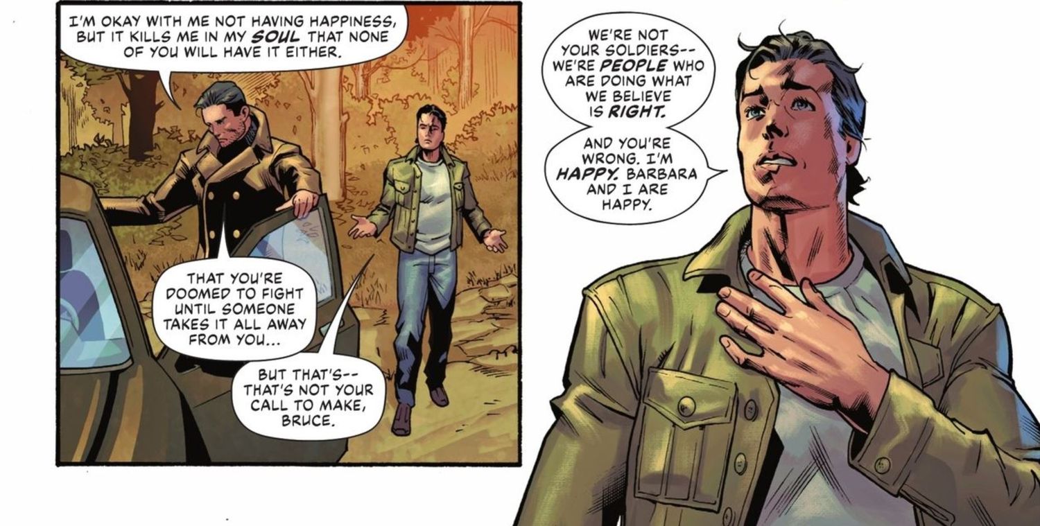 La cruzada de Batman para proteger Gotham a menudo se ha enmarcado como una guerra en la que la Bat-Familia sirve como infantería del Caballero Oscuro. Es una forma oscura de ver las cosas y parece que Bruce realmente siente que ha arruinado a su familia al arrastrarlos a su misión e impedirles encontrar la felicidad. Pero Nightwing afirma que él y Barbara son feliz y que nunca ha visto su heroica labor como una guerra. Esta diferencia de perspectiva revela mucho sobre Batman y Nightwing. Bruce nunca puede encontrar un final feliz porque está persiguiendo algo imposible. Pero Dick y otros han encontrado la felicidad que tanto se le escapa a su líder porque comprenden la importancia de las metas realistas.