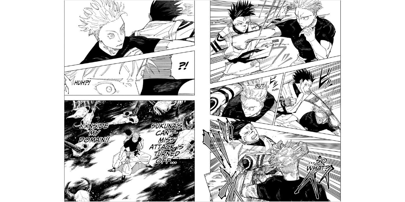 Akutami ilustra su significado con un análisis paso a paso de una escena de lucha de siete paneles y dos páginas de la reciente batalla entre Satoru Gojo y Ryomen Sukuna. Akutami divide la pelea en tomas en ángulo “largas o amplias”, “tomas medias o medianas” y “primeros planos”. Expresan movimiento sin necesidad de moverse. Lo hace aprovechando cómo los espectadores se han acostumbrado a ver películas y televisión, y las expectativas que tienen sobre lo que constituye una buena escena de acción “en vivo”. Básicamente, el enfoque de Gege Akutami no es muy diferente de cómo un director de cine o televisión abordaría una escena de pelea.
