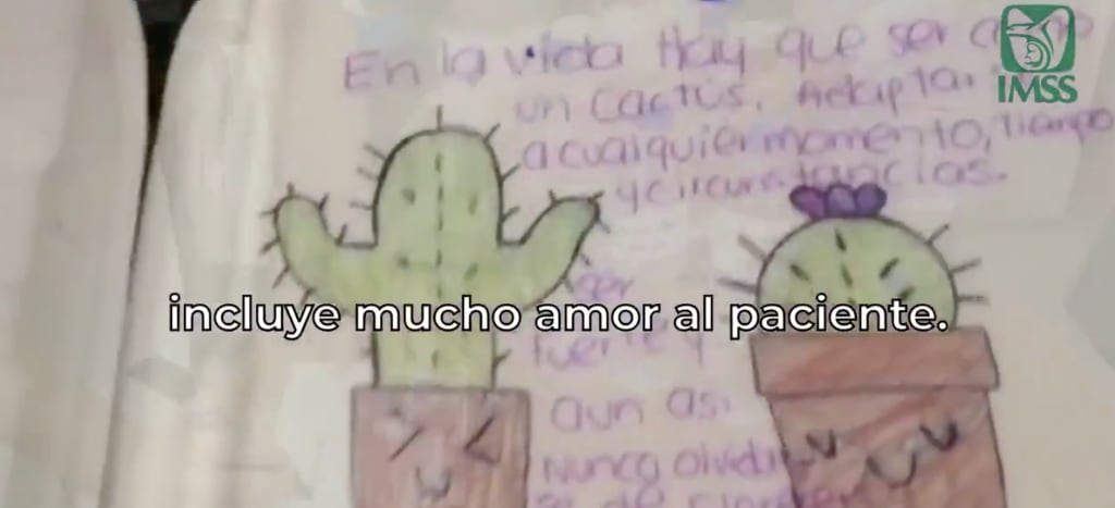 Durante la emergencia sanitaria, el personal de nutrición del Seguro Social escribe en las charolas de alimentación mensajes de aliento para los pacientes que están internados por Covid-19.