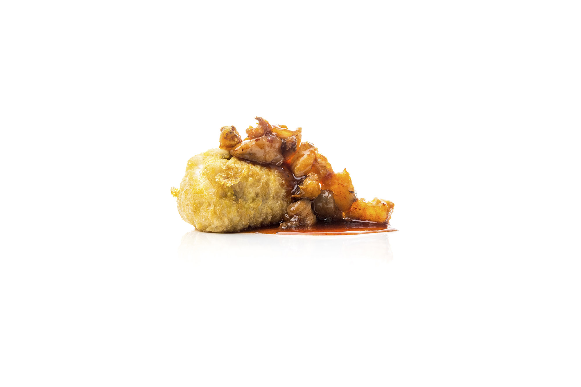 Calentar los callos marinos y añadir en el último momento los chicharrones. Disponer el rape a la romana y sobre él los callos marinos.