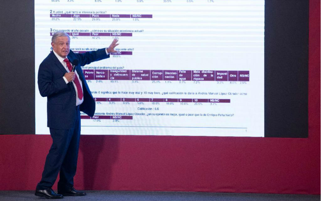 El primer mandatario reiteró que aún con los opositores a su administración, la gente lo sigue apoyando, y mostró la encuesta telefónica que se hizo desde la Subsecretaría de Desarrollo Democrático, Participación Social y Asuntos Religiosos de la Secretaría de Gobernación a 2 mil 500 personas.