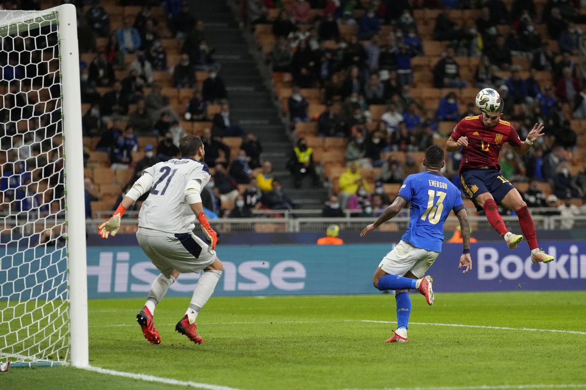 Al inmediato descanso, la azzurra ante el abismo. Pero es Italia, resistente como pocas. Y sufriente como ninguna cuando la trama le remite al esfuerzo agónico. El eterno Chiellini hizo de su gemelo Bonucci y Luis Enrique retiró al goleador Ferran por otro debutante, el canario Yeremy Pino. No se blindó el cuadro de Mancini y nunca racaneó España con el 0-2 y once contra diez, más predispuesta a la puntilla que a sedar el choque con el imán de la pelota. Chiesa evidenció que los de Mancini no se sentían desamparados con una carrera que consumó con un trallazo al poste izquierdo de Unai. La tuvo Oyarzabal con un cabezazo y con la Roja dale que dale, Donnarumma evitó el 0-3 con una parada atómica a Marcos, ese lateral-extremo-delantero (es un excelente cabeceador y lanzador de faltas).