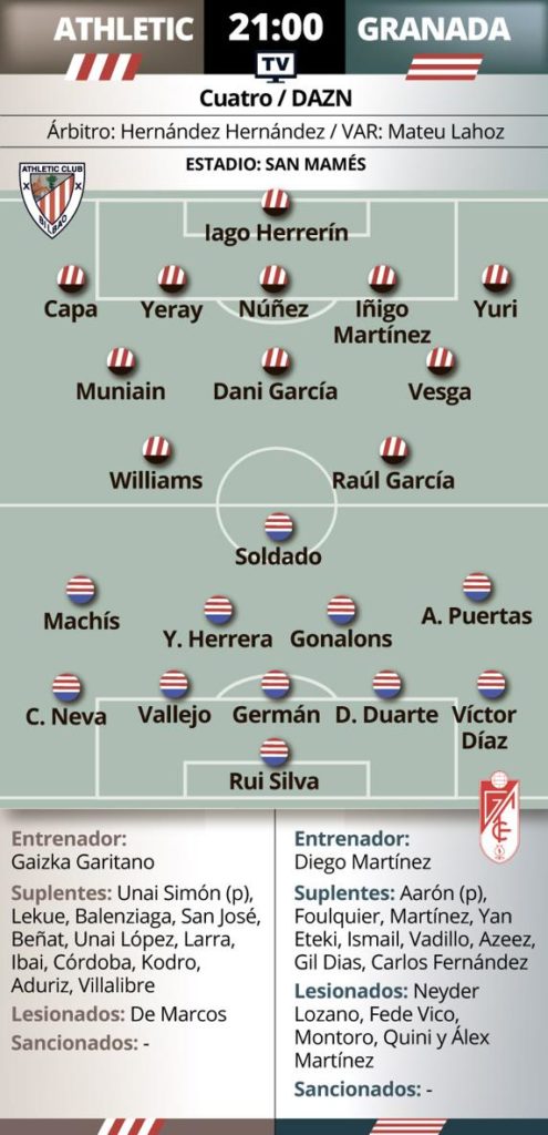 En el Granada, parece que Diego Martínez echará mano de la mayoría de piezas que no fueron titulares en el Wanda. El meta Rui Silva, el central Germán Sánchez, el medio Gonalons o el extremo Machís. El ala Vadillo y Soldado arrastran molestias, aunque parece que estarán disponibles. El veterano ariete, héroe por su doblete al Valencia en cuartos, y el joven Carlos Fernández se jugarían la plaza de nueve. Con un único punta enfrente, se supone que Garitano tiraría con una zaga de cuatro. Habrá que esperar, quizás el visitante juegue con cinco atrás como ante Valencia y Atlético.