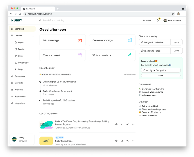 La gran idea de Norby es combinar servicios como LinkTree, Eventbrite y MailChimp en un solo servicio asequible basado en suscripción, que ofrece a cualquiera que maneje una comunidad en línea una solución única en lugar de un costoso mosaico de servicios que deben configurarse y administrarse individualmente. . Norby es ideal para pequeñas marcas y emprendedores individuales, y la mayoría de sus clientes ejecutan operaciones de menos de 10 personas. El conjunto de herramientas para creadores se basa exclusivamente en suscripciones y no cobrará tarifas como Eventbrite y otros servicios populares.