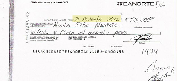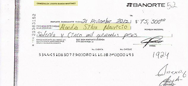 Cuando pactaron el precio del vehículo le expidieron un cheque de una chequera de Banorte a nombre de Esmeralda Judith Banda Martínez, sucursal Irapuato. (El cheque había sido reportado extraviado el 28 de noviembre de 2011, es decir, 11 meses antes de que se usara para defraudar a Abel).