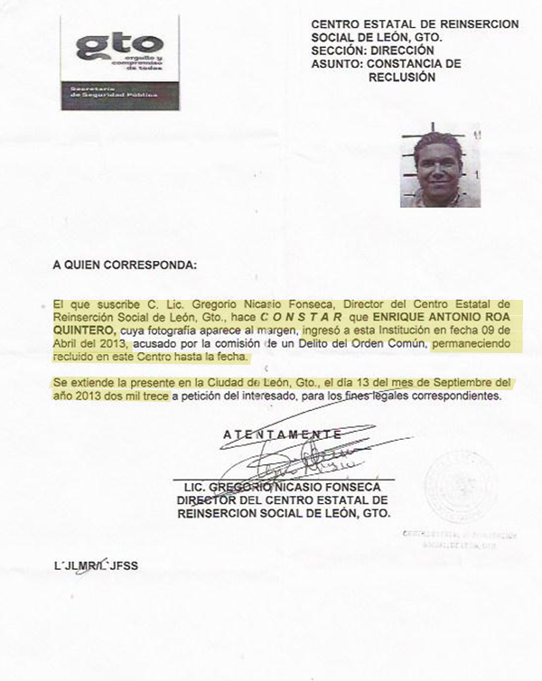El fraude contra José Luis ocurrió el 7 de junio de 2013. Aunque él declaró haber identificado a Ma. Guadalupe y sus hijos como sus defraudadores, ellos estaban en el Cereso de León, según las cartas de reclusión de madre e hijos.