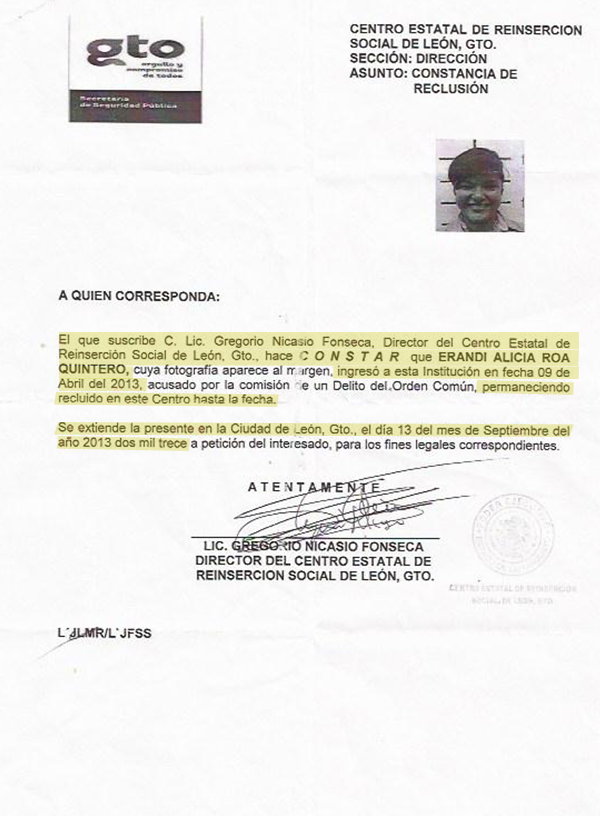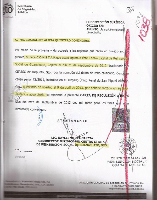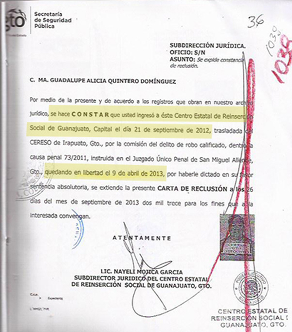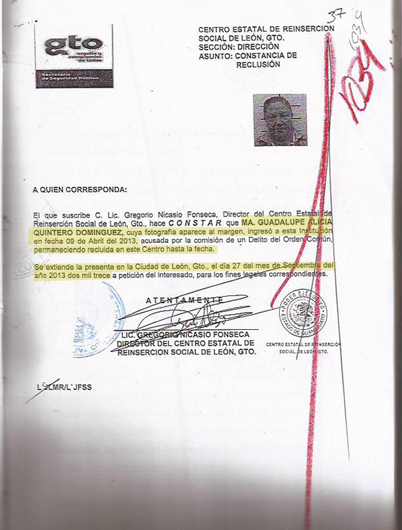 Como parte de esta investigación periodística, Aristegui Noticias solicitó a la Secretaría de Seguridad Pública de Guanajuato la fecha en la que Ma. Guadalupe Alicia Quintero estuvo presa en el Cereso de Puentecillas. La respuesta fue: del 21 de septiembre de 2012 al 04 de abril de 2013.