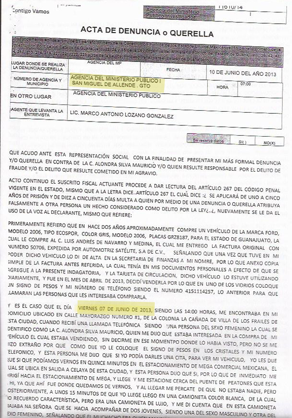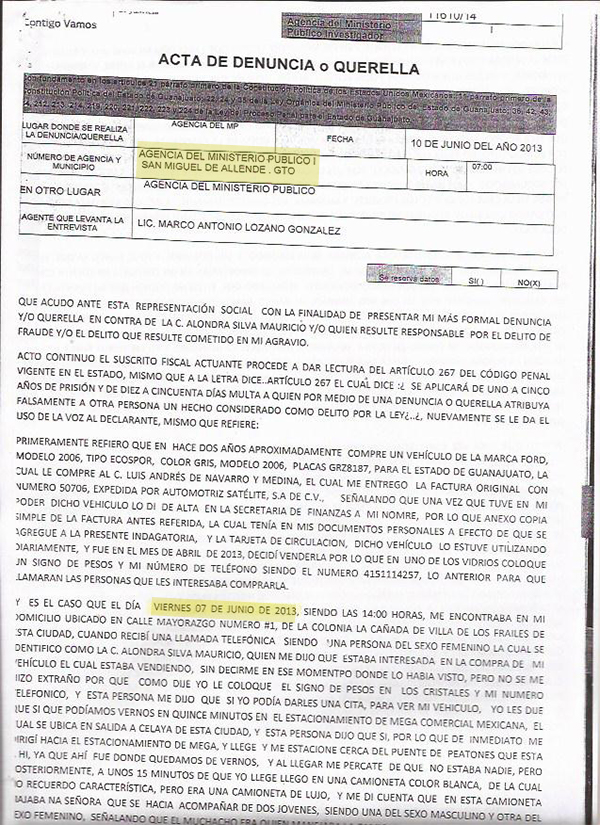 José Luis acudió ante la Agencia 1 del MP en San Miguel de Allende a presentar su denuncia. El agente Marco Antonio Lozano le tomó su declaración en la que describió la media filiación de los defraudadores. Al día siguiente José Luis volvería con su madre en calidad de testigo para ratificar la descripción.