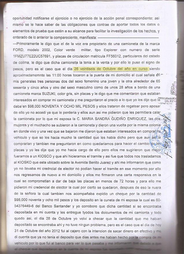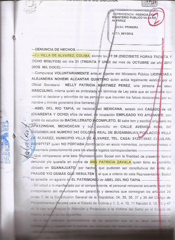 El 31 de octubre de 2012, Abel acudió ante el MP de Villa de Álvarez para denunciar por fraude en la compra de su camioneta Ford tipo Explorer, a quien se identificó con él como Ana Patricia Zavala.