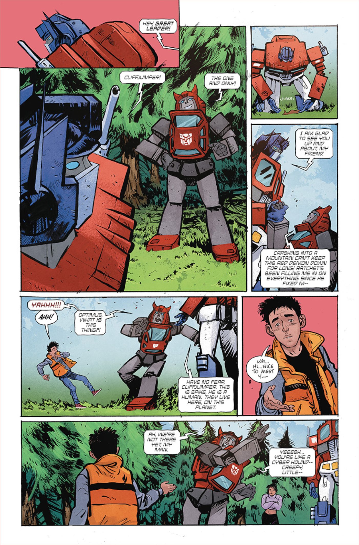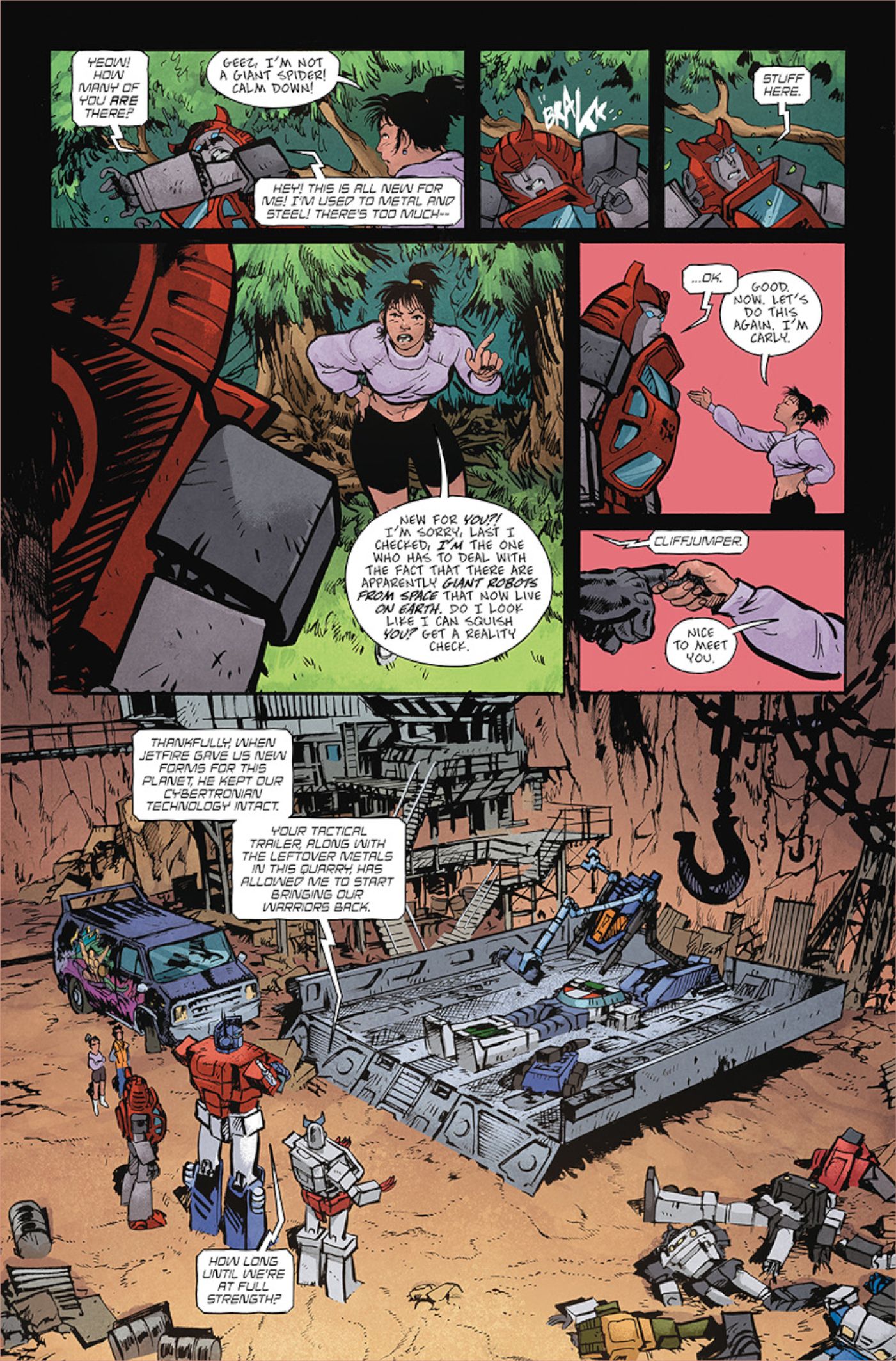Publicado directamente en el sitio web de Skybound, el avance de Daniel Warren Johnson, Mike Spicer y Rus Wooten continúa donde Transformadores El número 1 terminó, con Spike Witwicky y su novia Carly ayudando a Optimus Prime y los Autobots restantes luego de un ataque de los Decepticons.
