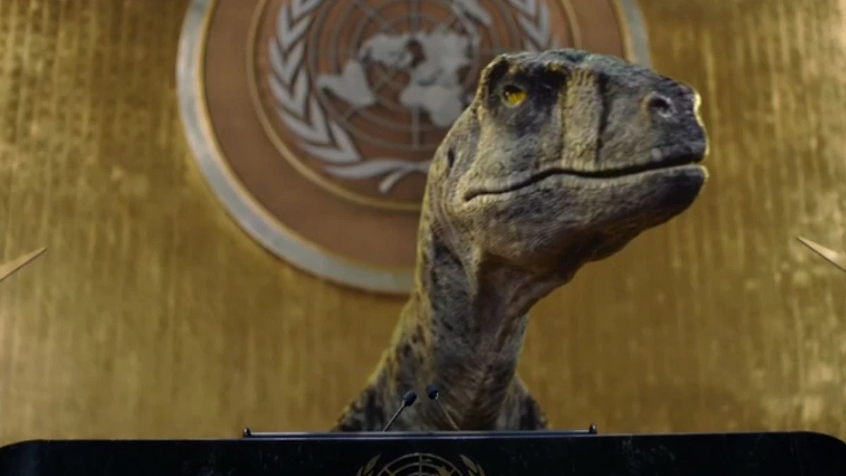“Nosotros al menos tuvimos un asteroide”, dice desde la tribuna de oradores el dinosaurio, para incidir en que el calentamiento del planeta es una amenaza bien conocida que no pilla por sorpresa a nadie. “¿Cuál es vuestra excusa?”, incide.