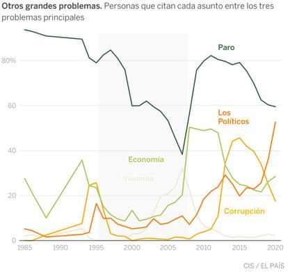 Con los problemas sociales pasa algo parecido. Es chocante revisar las preocupaciones de los españoles de hace 20 años, hay miedos que han desaparecido sin grandes celebraciones. Un ejemplo —comprensible— es el terrorismo de ETA. En el 2000 era el primer problema para los españoles, según los datos del CIS. Si se preguntaba qué tres problemas tenía el país, hasta el 75% de la gente señalaba a ETA. Ese año la banda asesinó a 23 personas. Sus atentados eran una trágica rutina. Mataron a concejales y guardias civiles, a un juez, a un conductor de autobús y a un profesor que entraba en su casa de regreso de la Universidad. Me acuerdo porque tenía 19 años, pero eso no evita que rememorarlo me provoque extrañeza, como si fuese irreal: le pegaban un tiro a gente que andaba por la calle en Barcelona, Granada, Tolosa (Gipuzkoa) o Durango (Bizkaia).